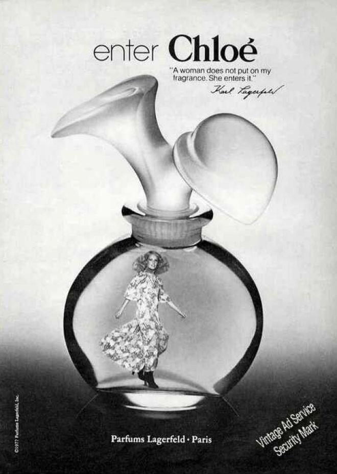 Chloe was presented in 1975 by the House of Karl Lagerfeld. It won the Fragrance Foundation Award for Packaging. The sculpted and frosted calla lily stopper and spherical glass bottle are wrapped in delicate peach and white print. So what does it smell like? It is a floral fragrance made up of 178 oils and rare essences dominated by a tuberose top note and blended with rose, lily of the valley, jonquil, Cormoroan ylang ylang, coriander, Bulgarian rose, iris, sandalwood, honeysuckle, Grasse jasmine, and orange blossom...